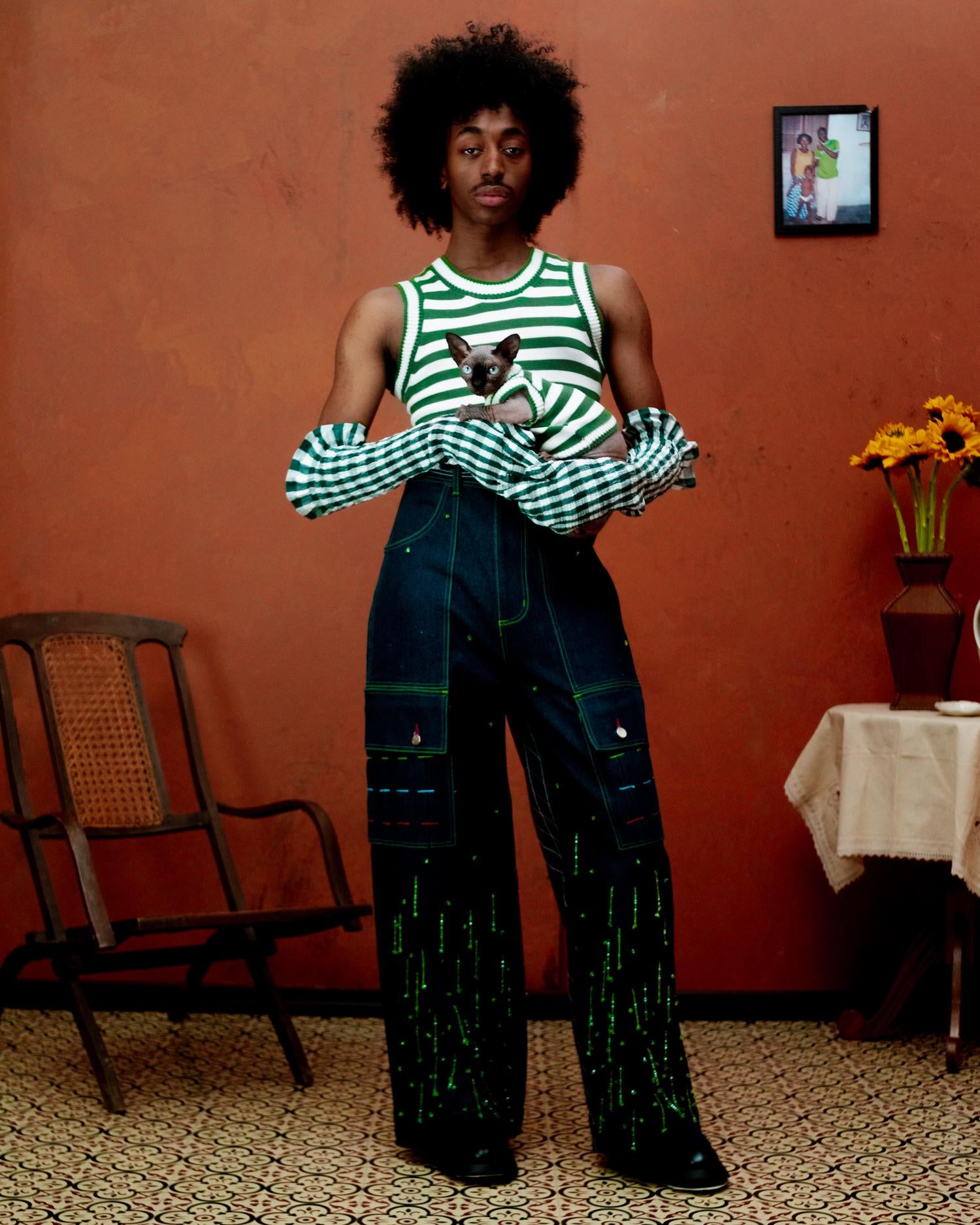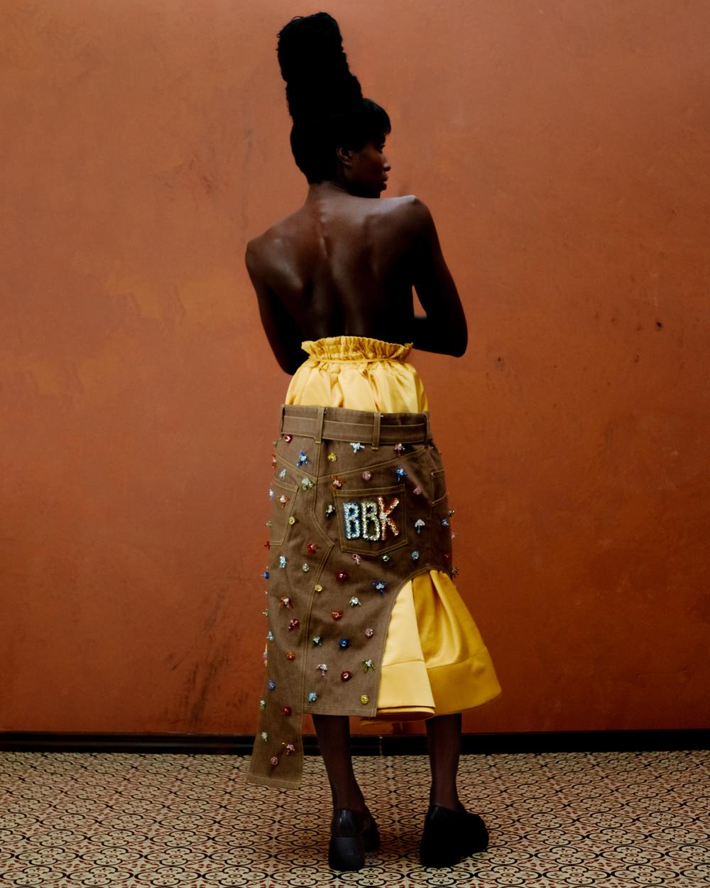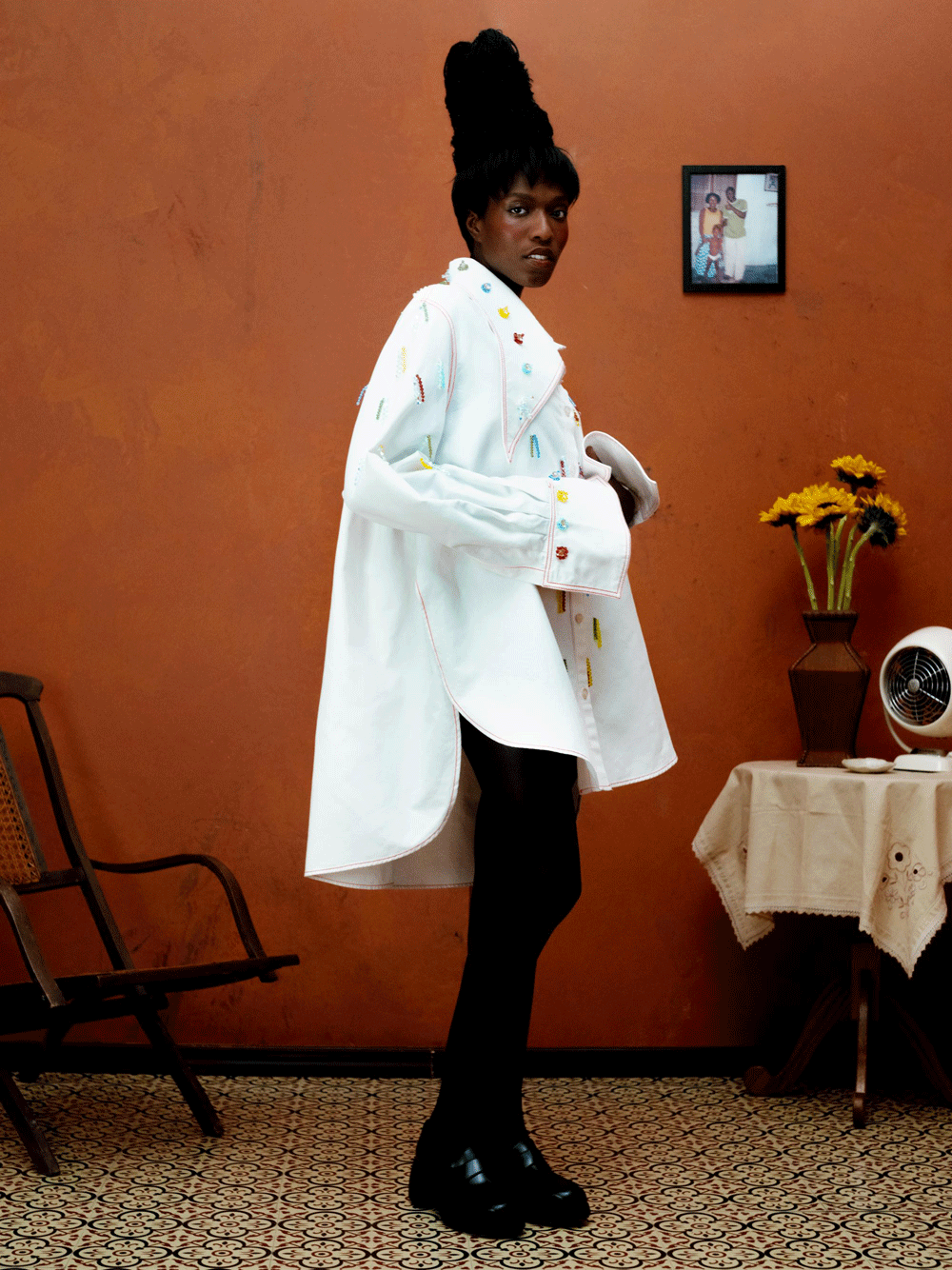 Throughout the collection, there are references to the authentic foods and drinks that I used to consume associated with my upbringing. Drinks like Malta, and Fanyogo ice cream are referenced in the forms of prints, embroidery and beading. This act of humor speaks to the childlike nature I tapped into while creating this collection.