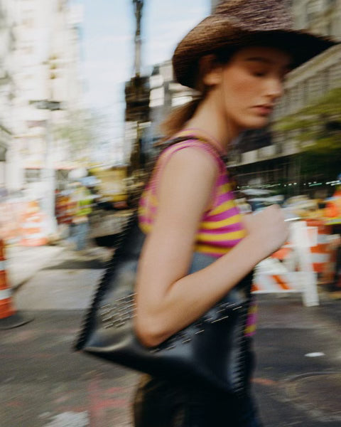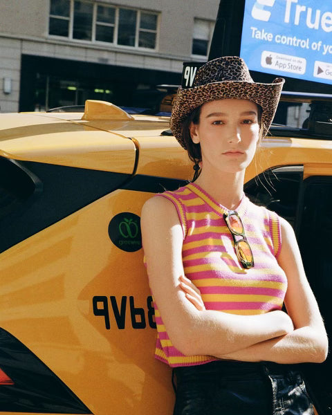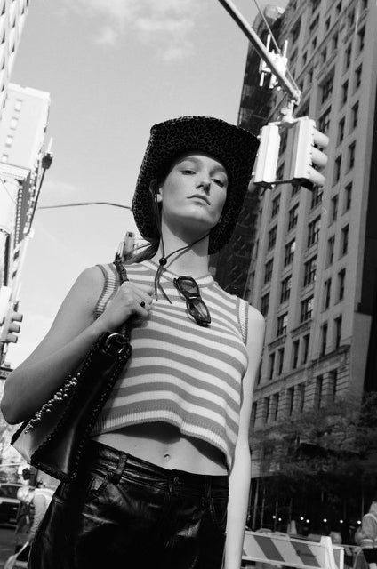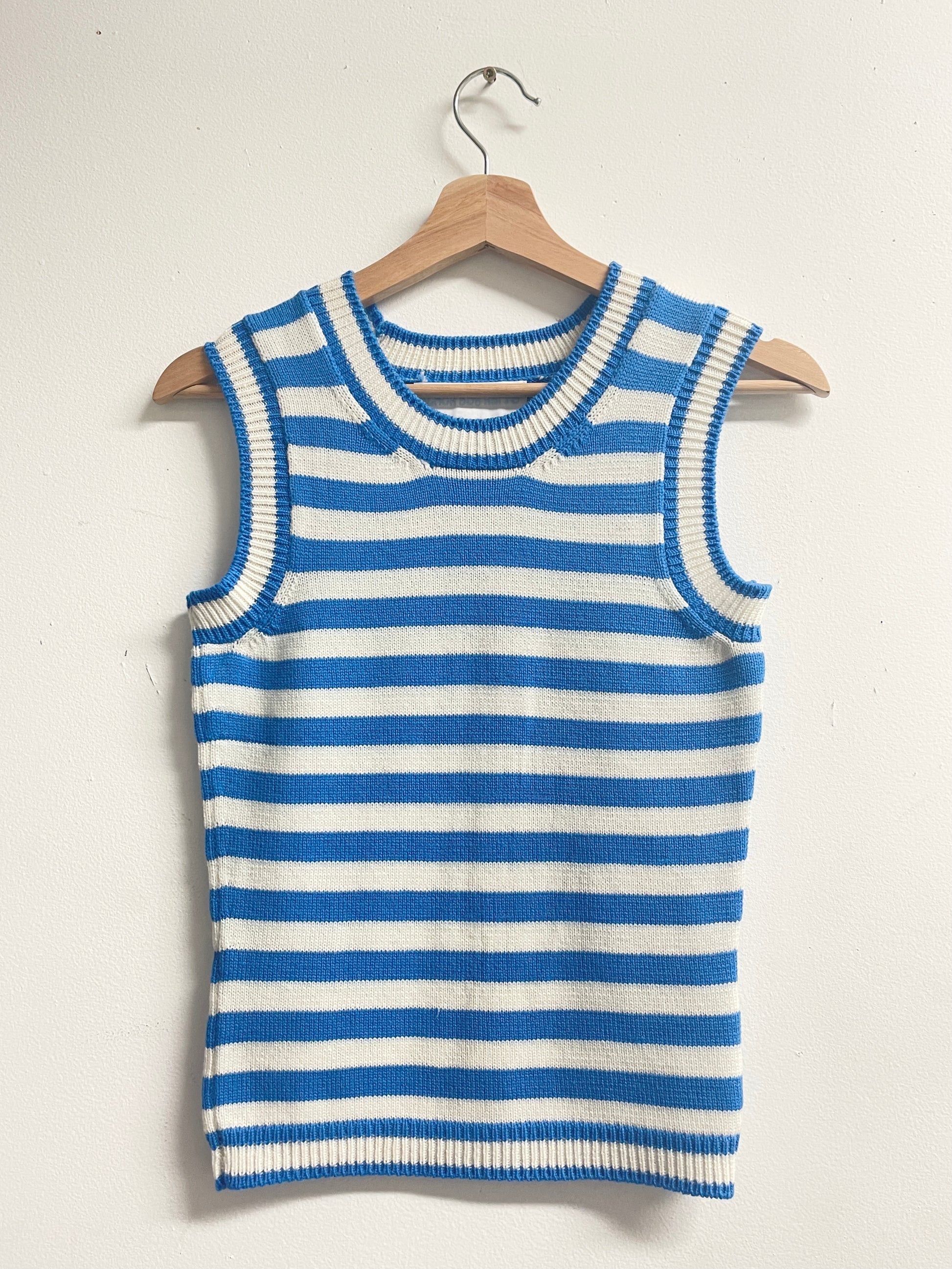 This multi-stripe tank is lightweight and is designed to hug the body perfectly. It is fully fashioned with accented trims on the arms, neck, and hem. Handmade on a flatbed knitting machine in our studio using 100 % soft merino wool.